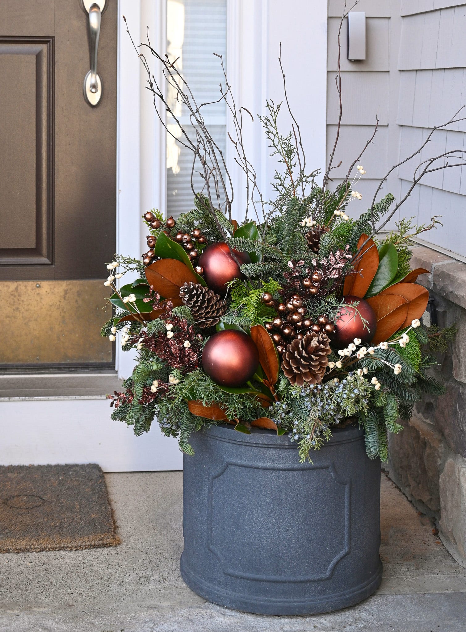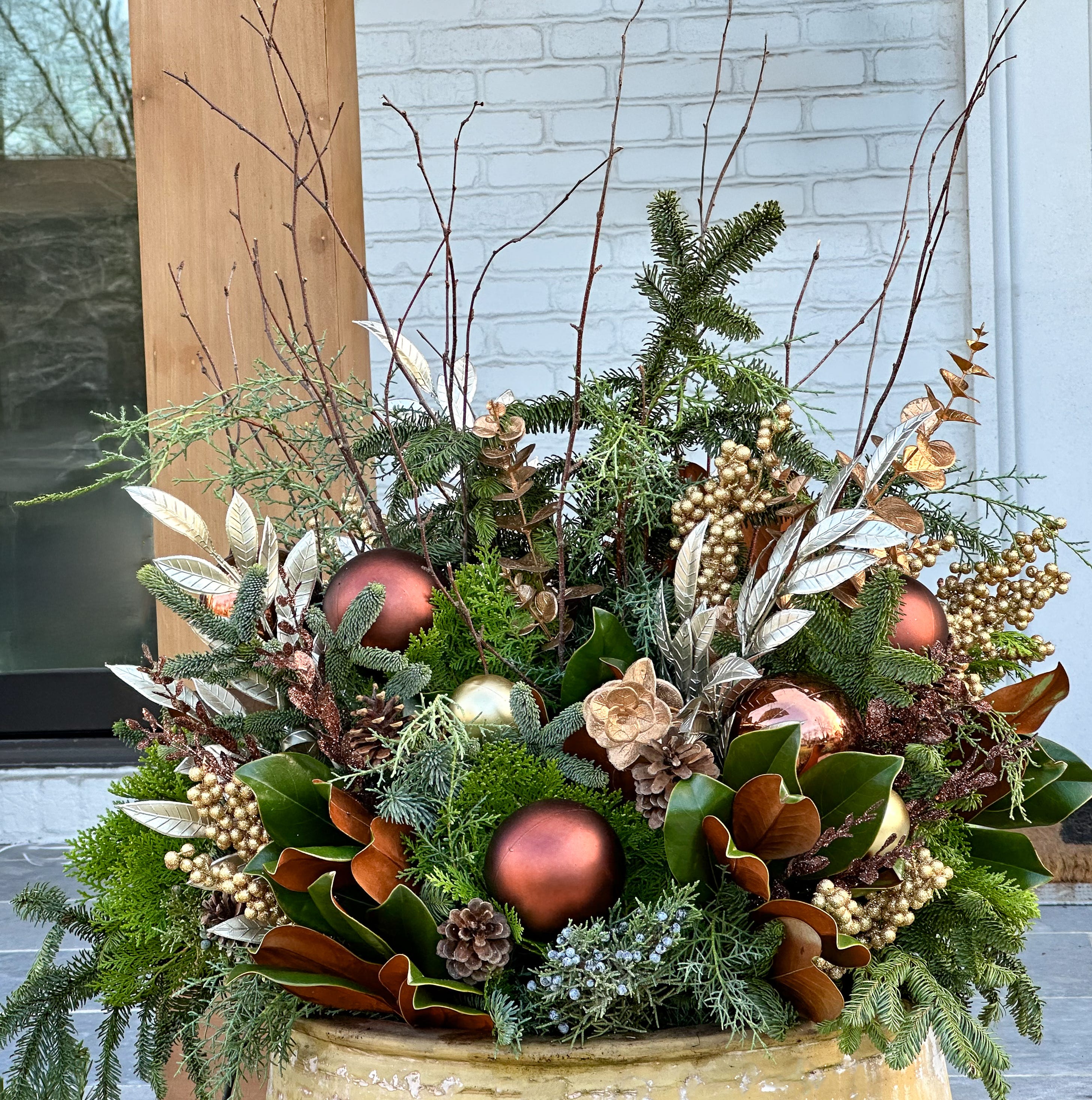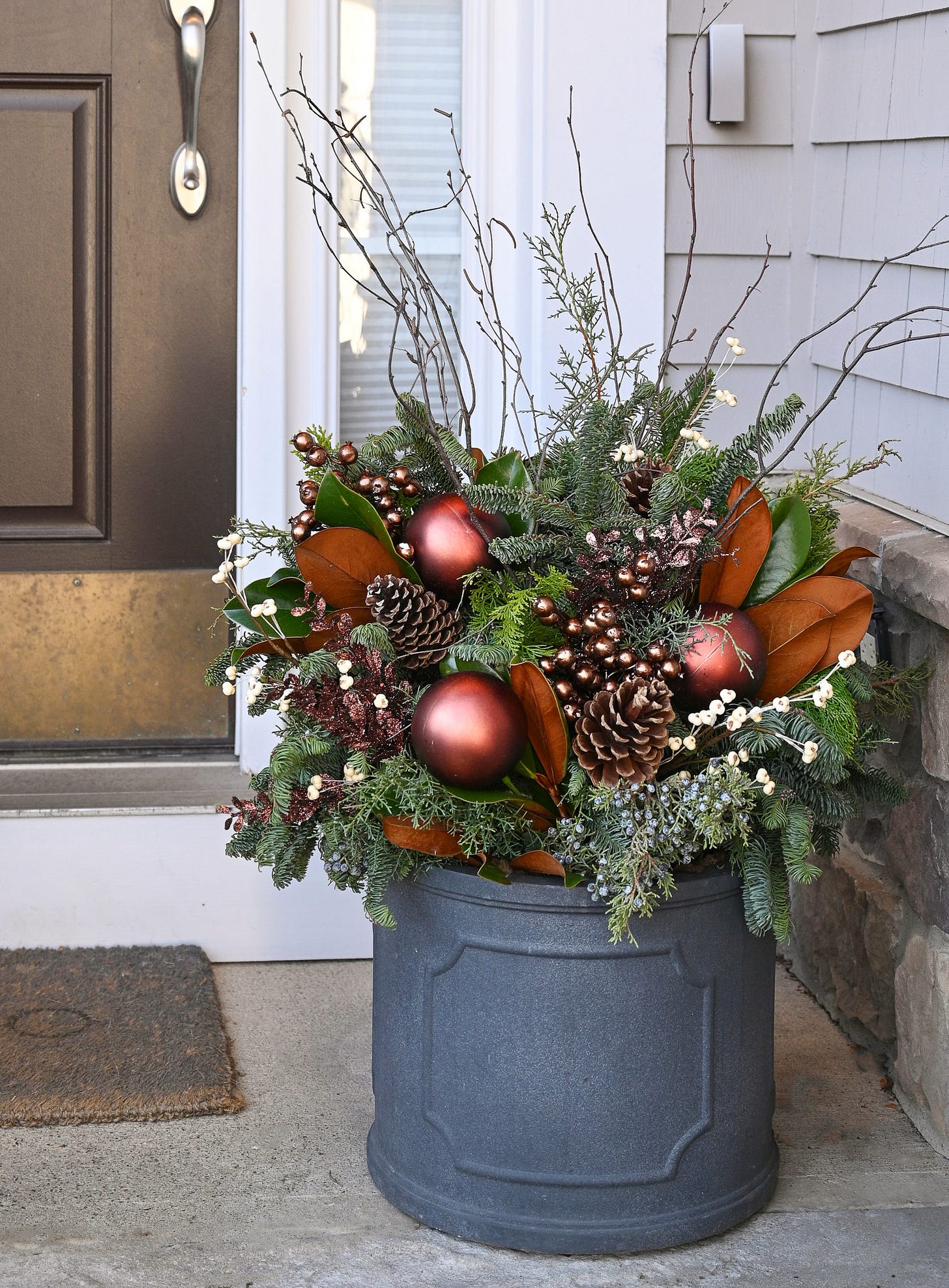When December arrives, so do the winter containers. What I love most about these pots is the way they bring life and a bit of magic to your home just as the world has gone cold and gray. As a change from the classic red holiday look, bronze has become a favorite in our winter pots. It is warm and earthy, with a soft glow that feels so welcoming at the front door. This color story lends an elevated, elegant look to winter containers without ever feeling too traditional or overdone.