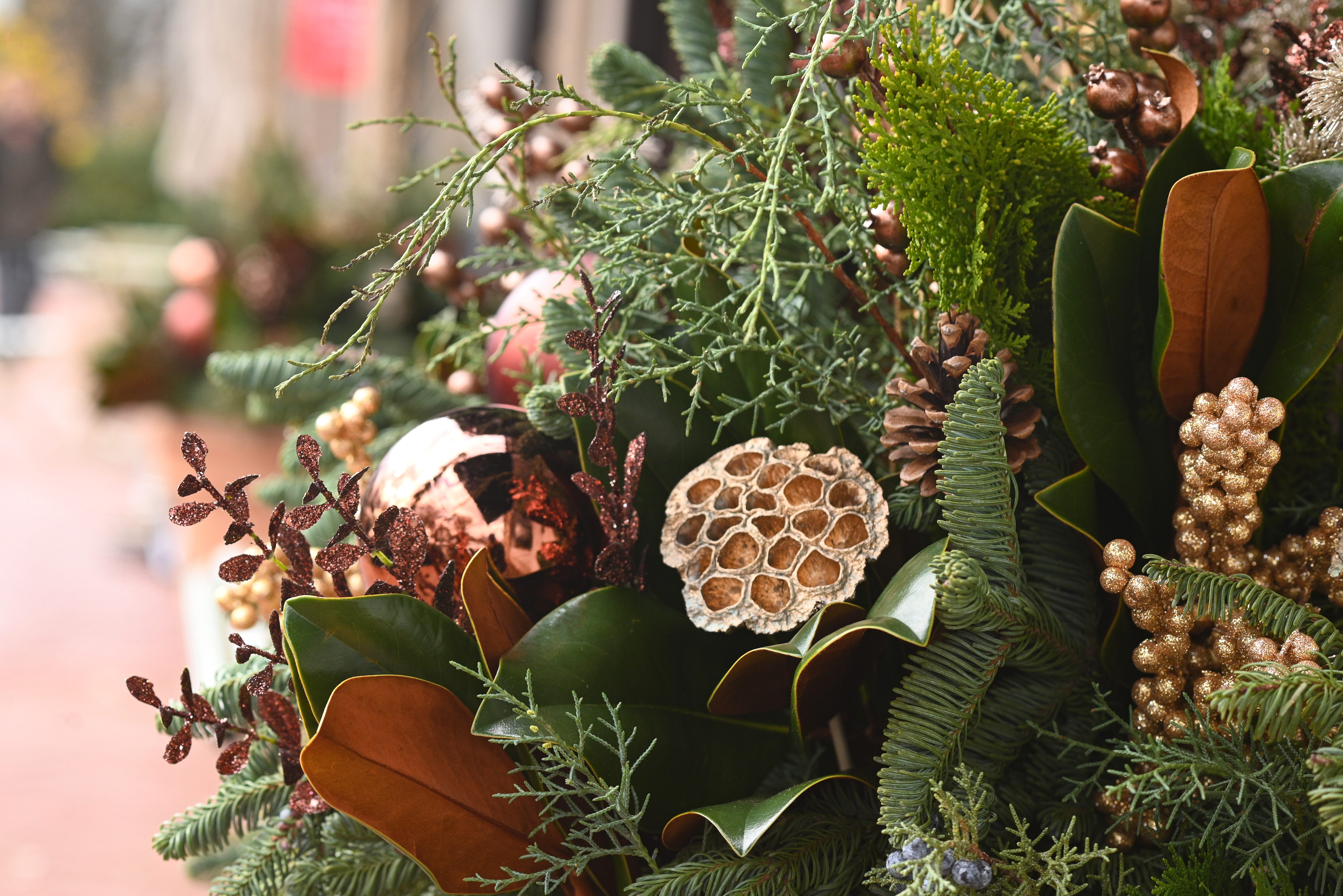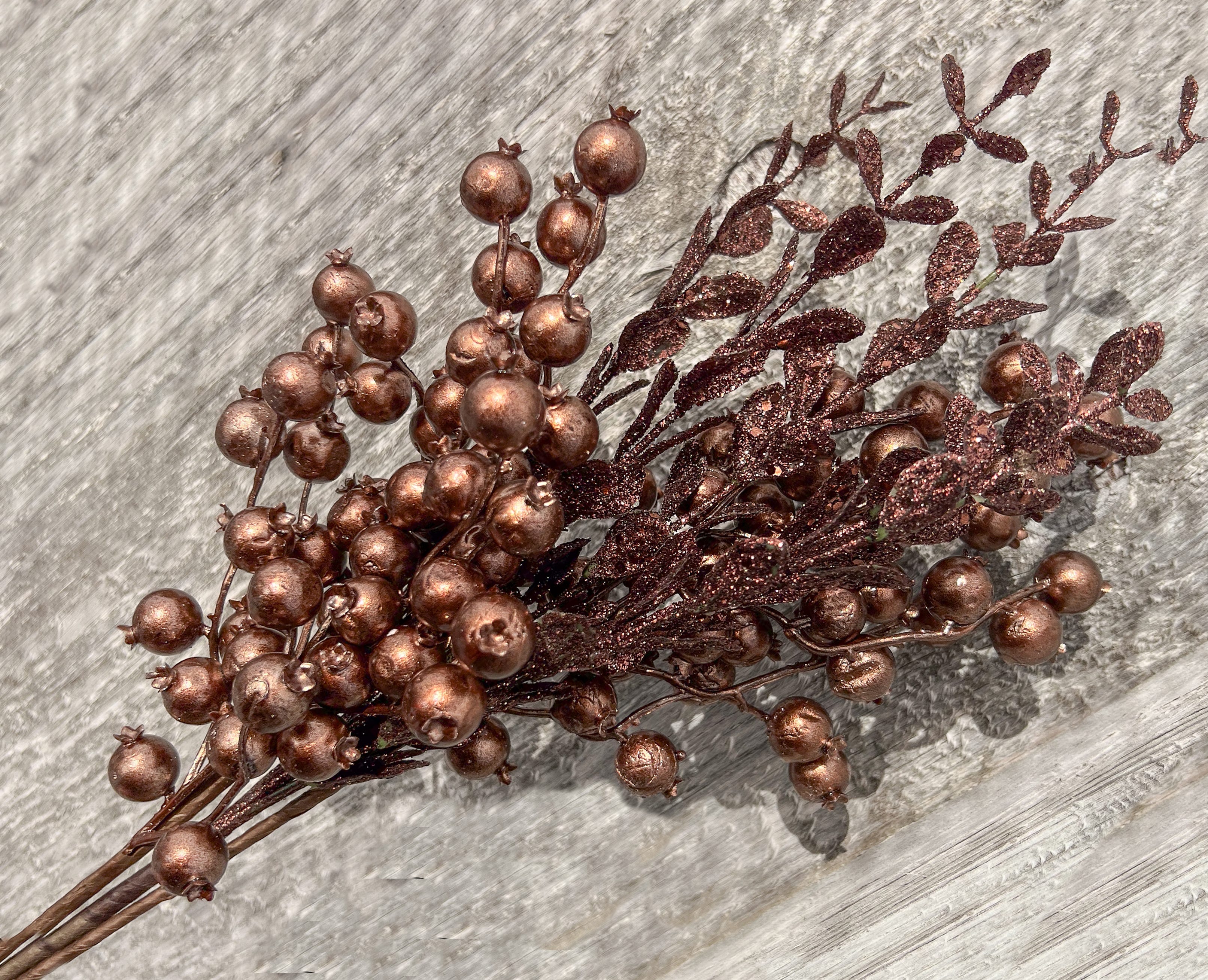 Now for the fun part. We sprinkle in assorted metallic accents in a range of bronze tones for just a bit of sparkle. We like to use ornaments, but we also tuck in different berries, glitzy stems, leaves, and whatever other interesting pieces we can find. The key is to not overdo, and we always add a touch of another shade, like silver or white, so the bronze elements really pop.