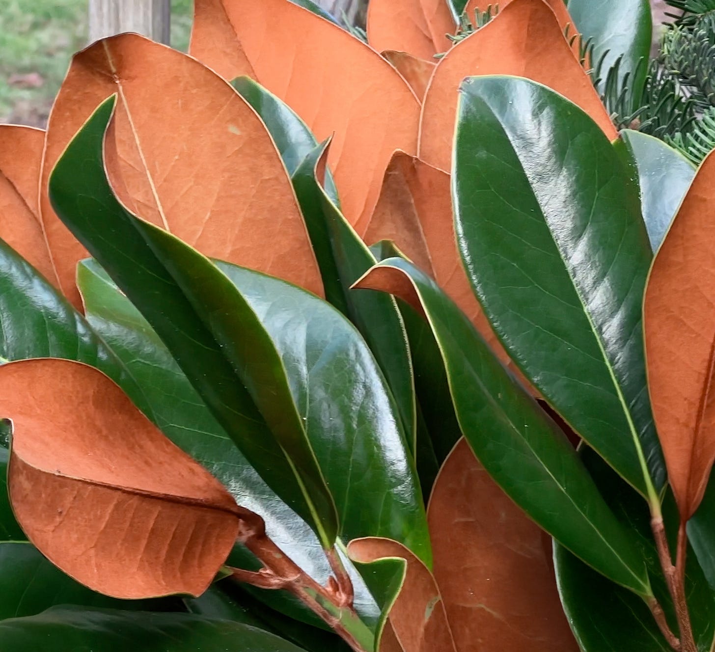 Start with an evergreen base in a mix of hues and textures. For this container we used noble fir, Carolina sapphire cypress, cedar, and juniper. (To learn more details on each evergreen check out Classic Natural Winter Containers.) The key is weaving magnolia leaves throughout so their warm foliage complements the bronze accents and pulls everything together.
