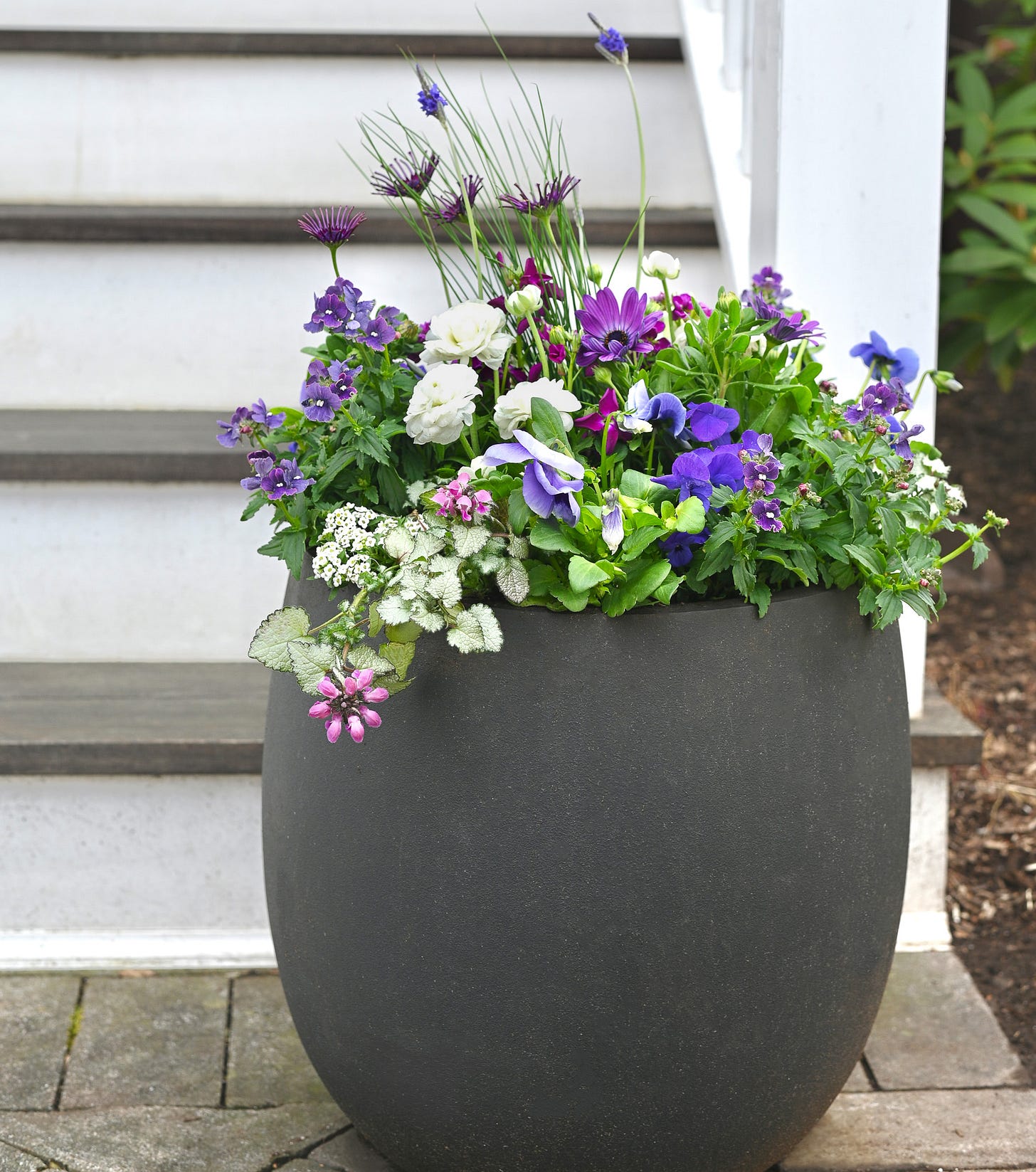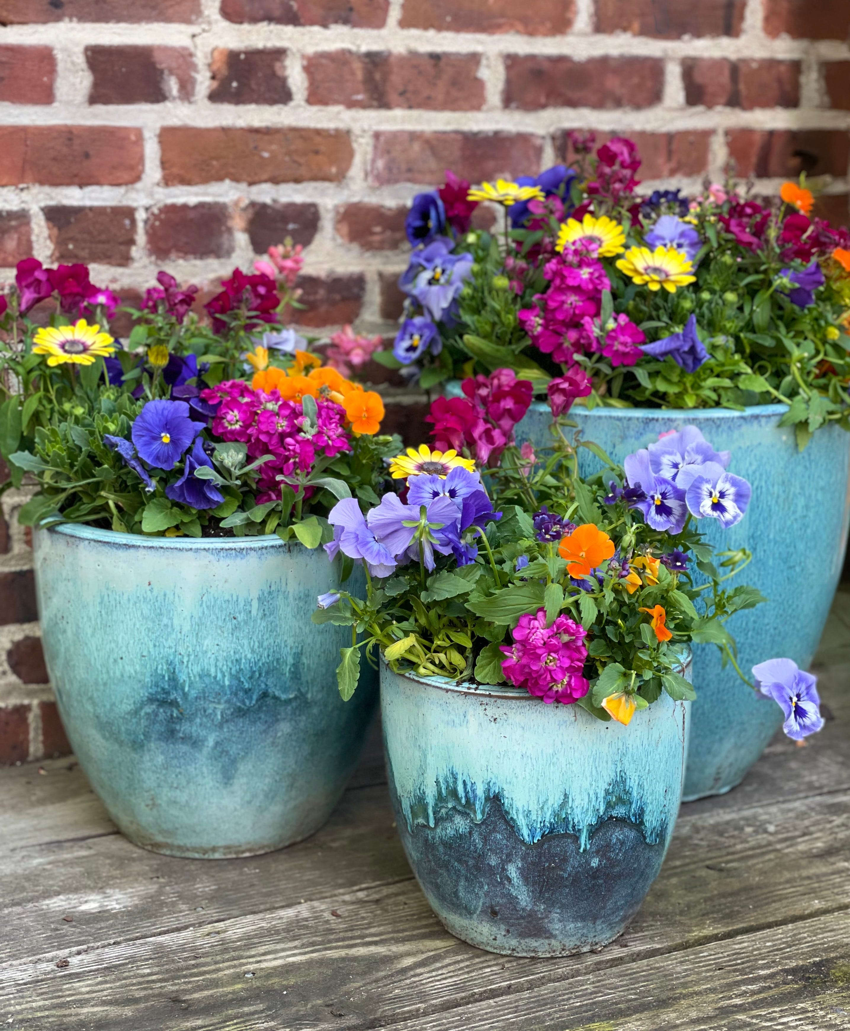 As a general rule of thumb, I find that a 15” diameter circle or a 14” square is the perfect size for pots. This is big enough for impact but not too overpowering. When containers are too big the individual blooms don’t stand out as much. I suggest buying taller and smaller vs. shorter and wider. The height will add interest without taking up much space. Keep in mind that the bigger the pot the more expensive it is to fill.