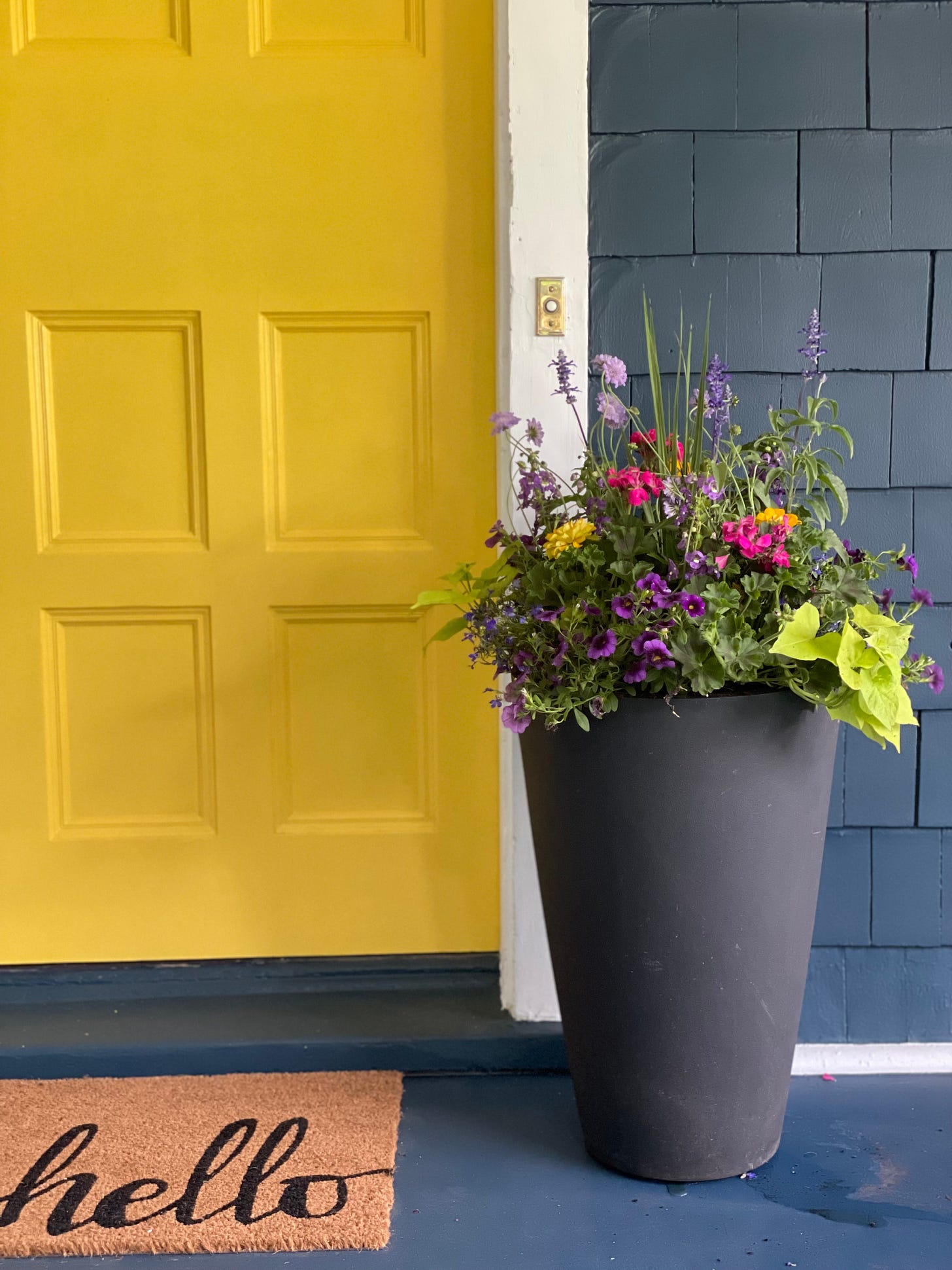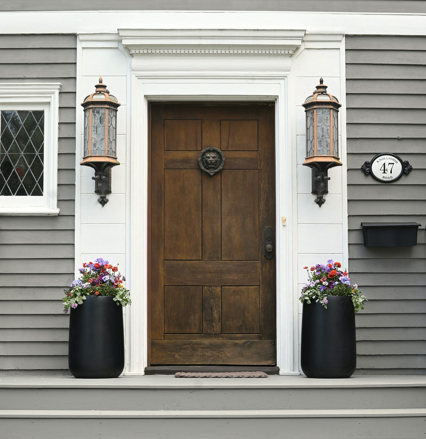 Whether you prefer a rustic look, or something more ornate, your flowers should complement the pots you put them in. You don’t want the containers competing with the blooms. I personally prefer an understated, simple design that allows the flowers to steal the show. I always suggest buying just two matching pots, but if you want more, buy in odd numbers and stick with one color scheme.