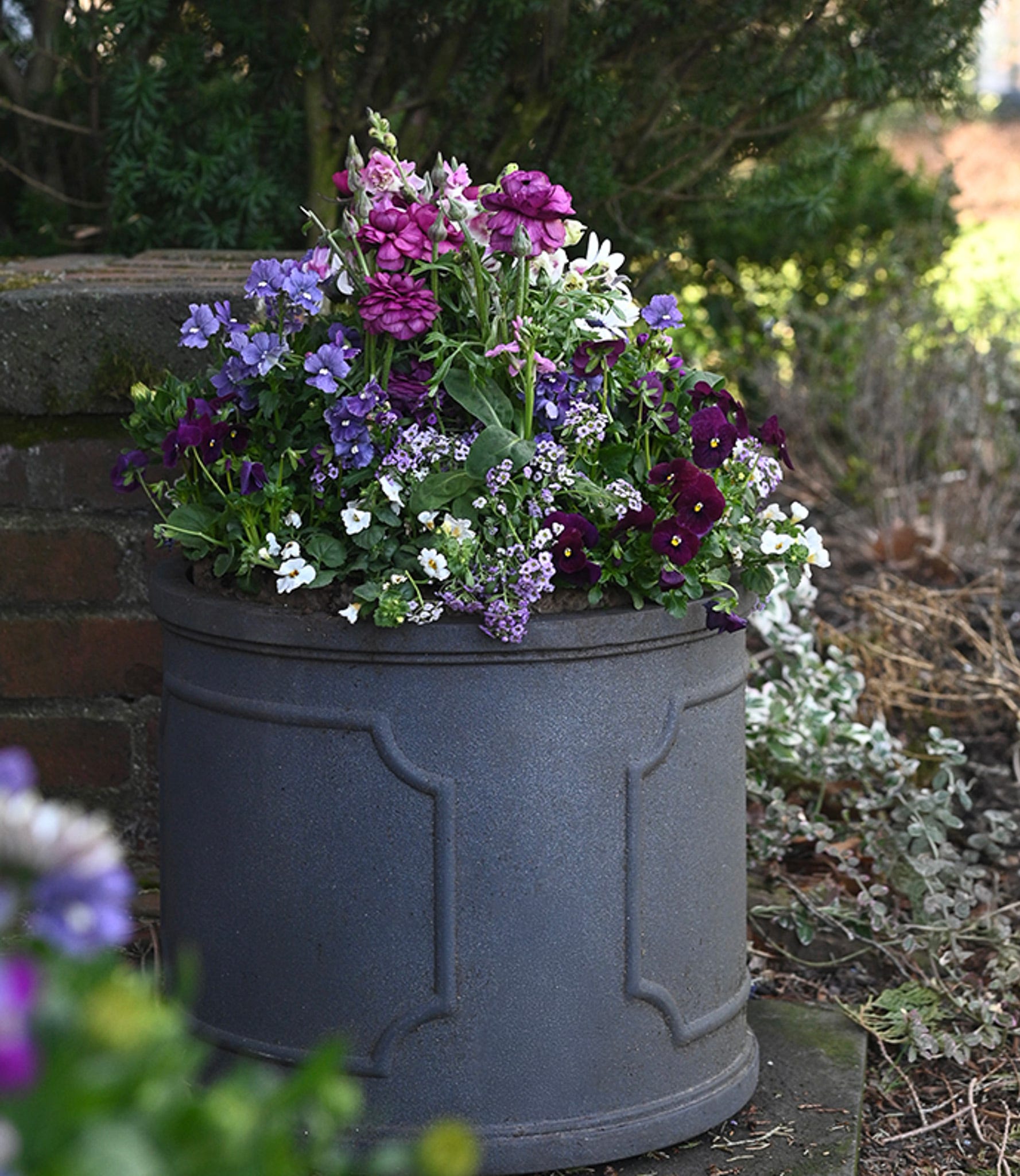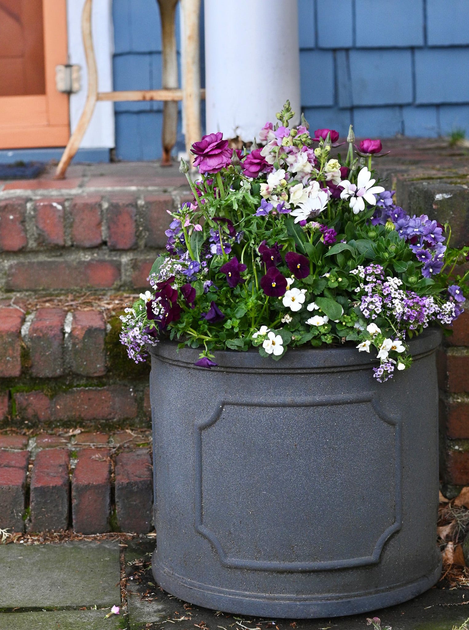 Violas are the sweet accent that gives this charming container its soft dimension. They tuck into every little gap, quietly tying the whole color story together with their more muted tones.
