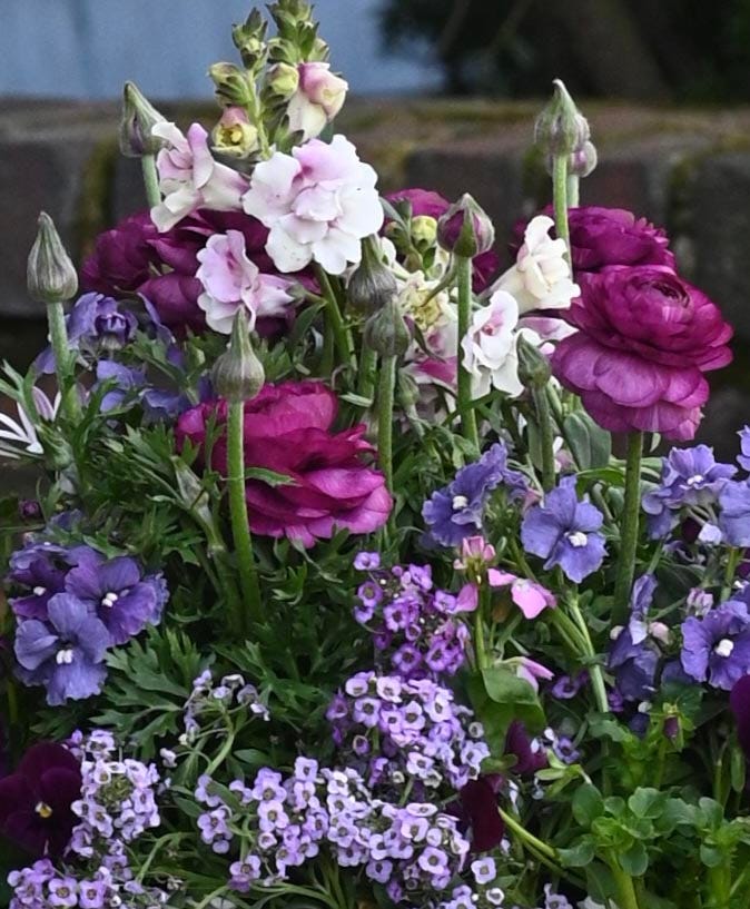 For the Vintage Violet Container, I stayed in a tight family of moody purples, soft lilacs, and creamy whites to keep everything calm and romantic. The gentle pastels bring that fresh spring welcome, while the deeper violet blooms add a rich accent. A few touches of soft green foliage allow all of the colors to stand out, creating a palette that feels both elegant and understated.