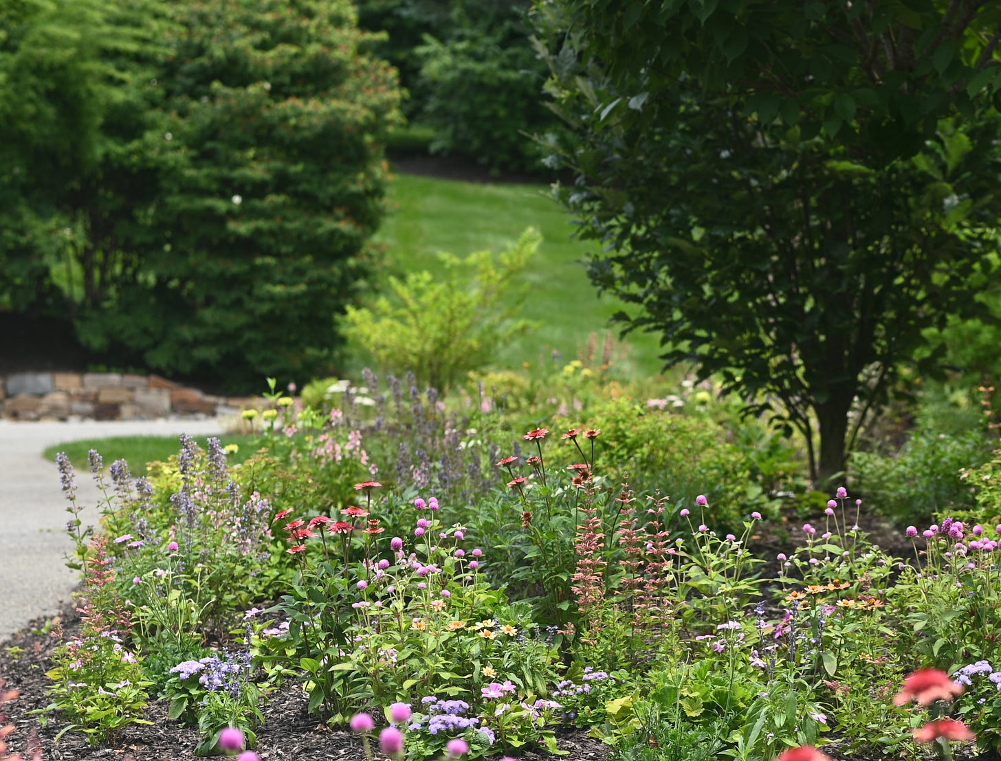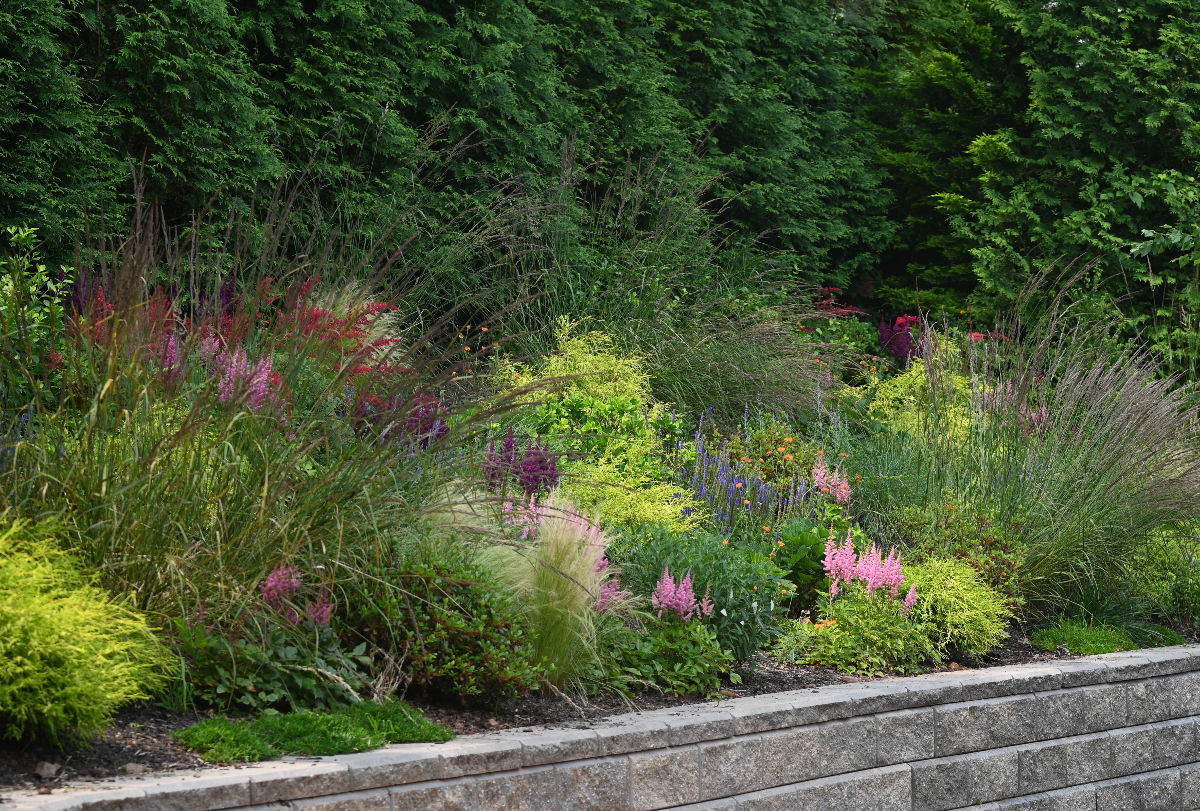 Plant selection for this type of garden is all about texture and movement that lend a sense of serenity. Since The Inspired Garden is all about the flowers, most of the garden is filled with flowering perennials, then layered with grasses and small shrubs for structure.